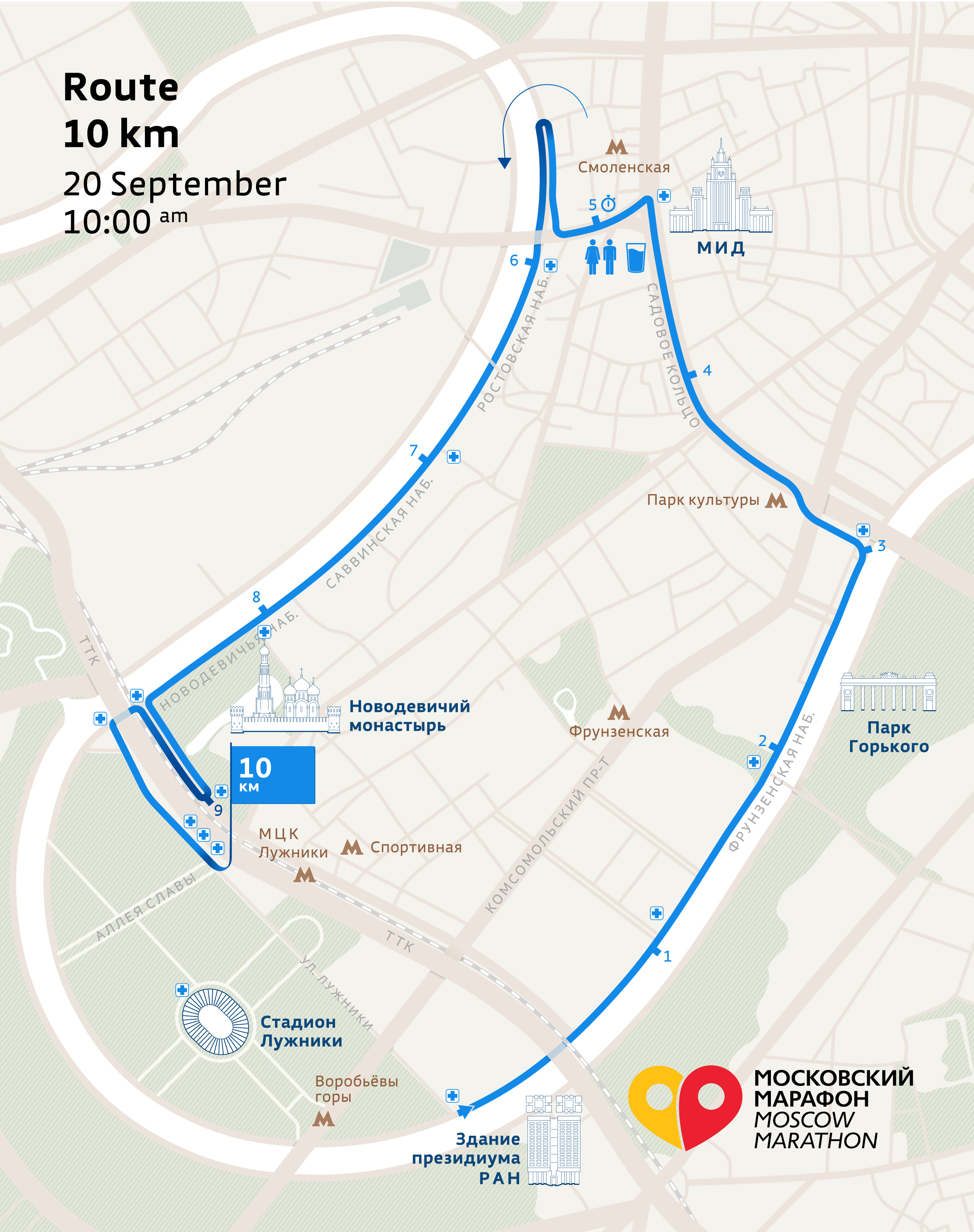 The 10 km route runs along Luzhnetskaya and Frunzenskaya embankments, Zubovsky and Smolensky Boulevards , and also Smolenskaya, Rostovskaya, Savvinskaya and Novodevichya embankments and Luzhniki street.