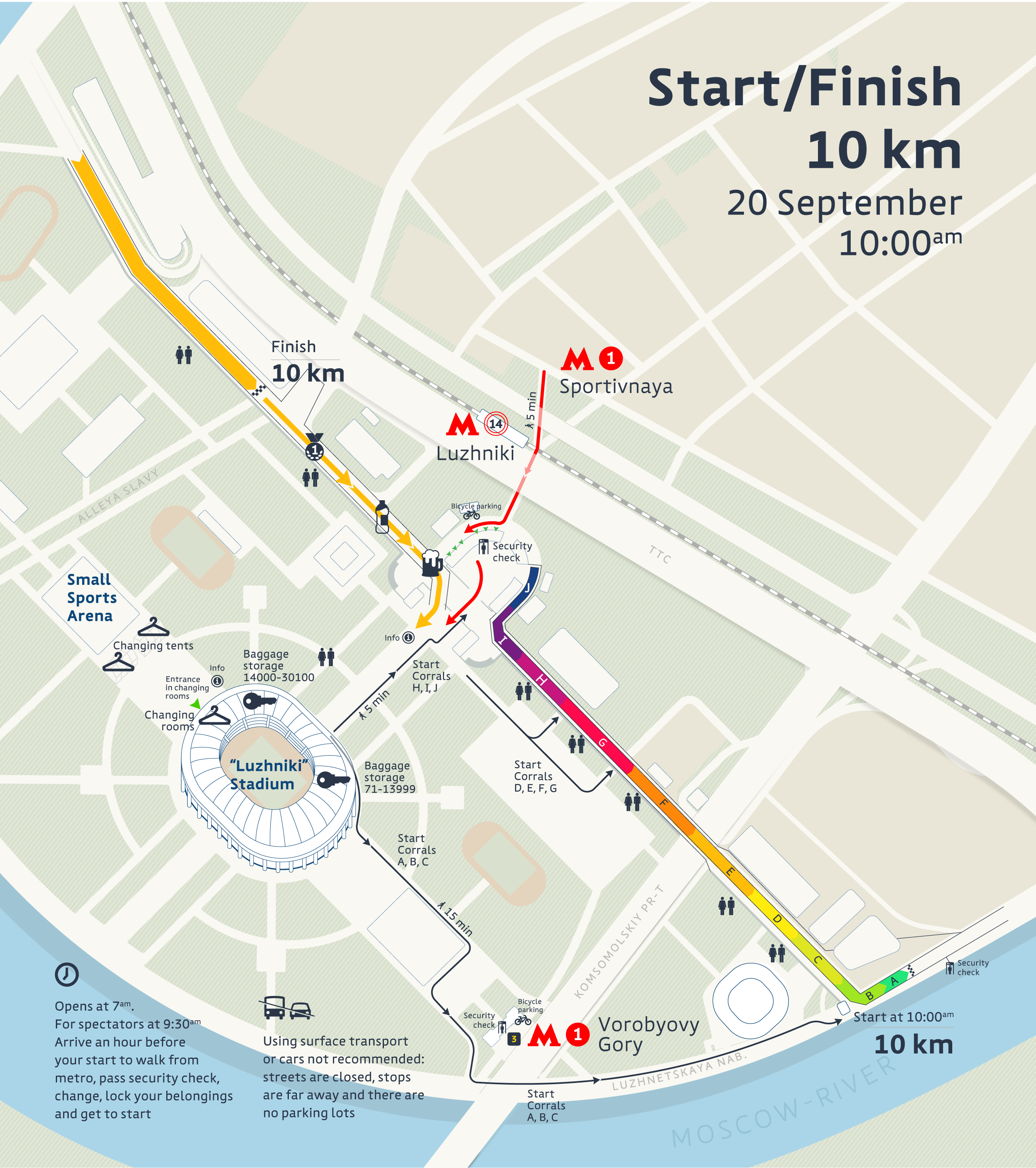 The Moscow Marathon start and finish area will open to spectators 30 minutes before the start of each race.
