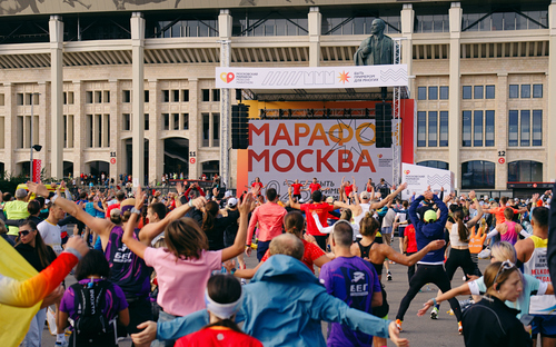 Открытие финишного городка, начало работы раздевалок и камер хранения для участников забега на 10 км на территории Олимпийского комплекса «Лужники».