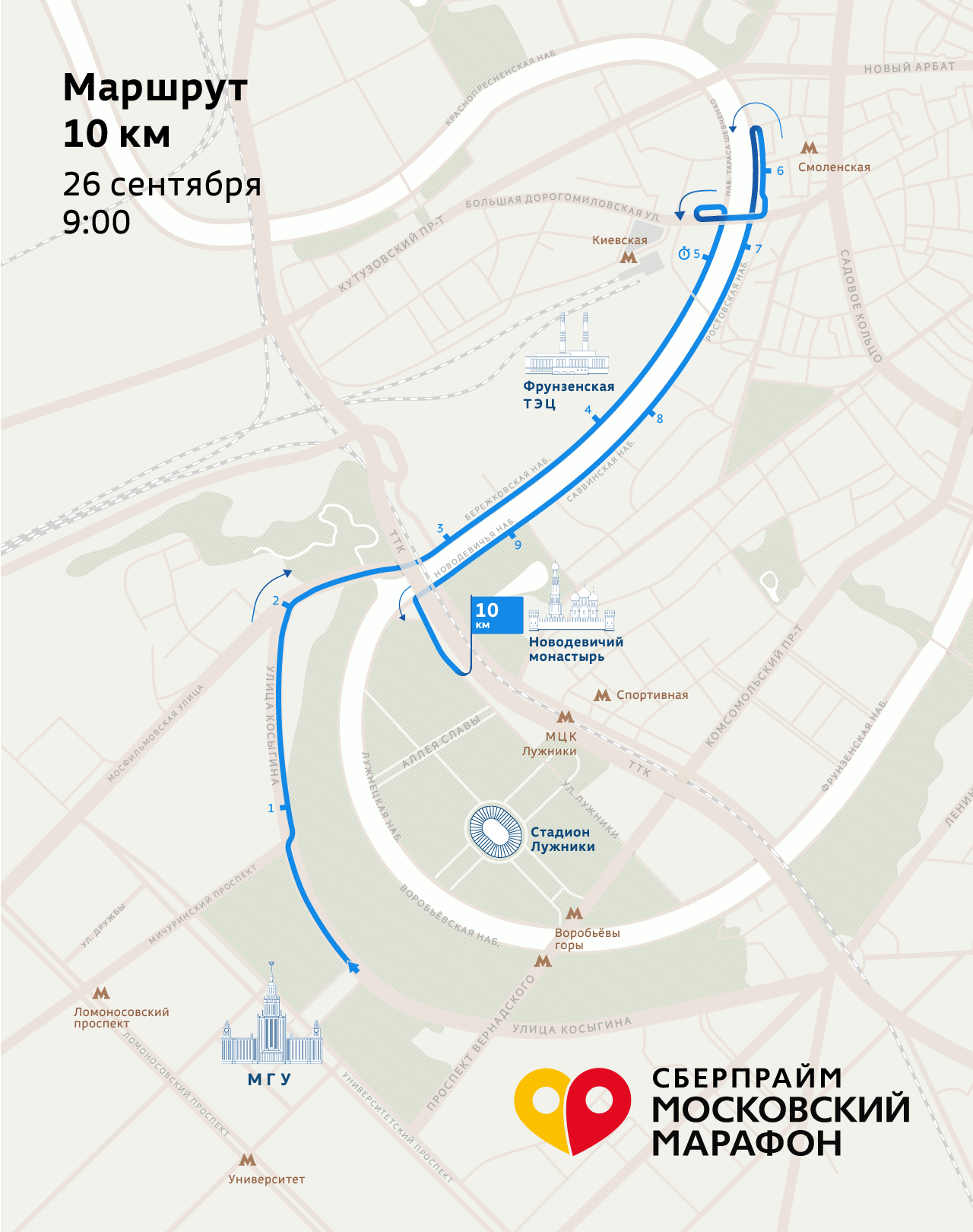 Старт состоится около Университетской площади МГУ имени М.В. Ломоносова, а финиш на улице Лужники. Маршрут забега на 10 км пройдёт по улице Косыгина, Бережковской и Смоленской набережным, Бородинскому мосту, а также Ростовской, Саввинской и Новодевичьей набережным.